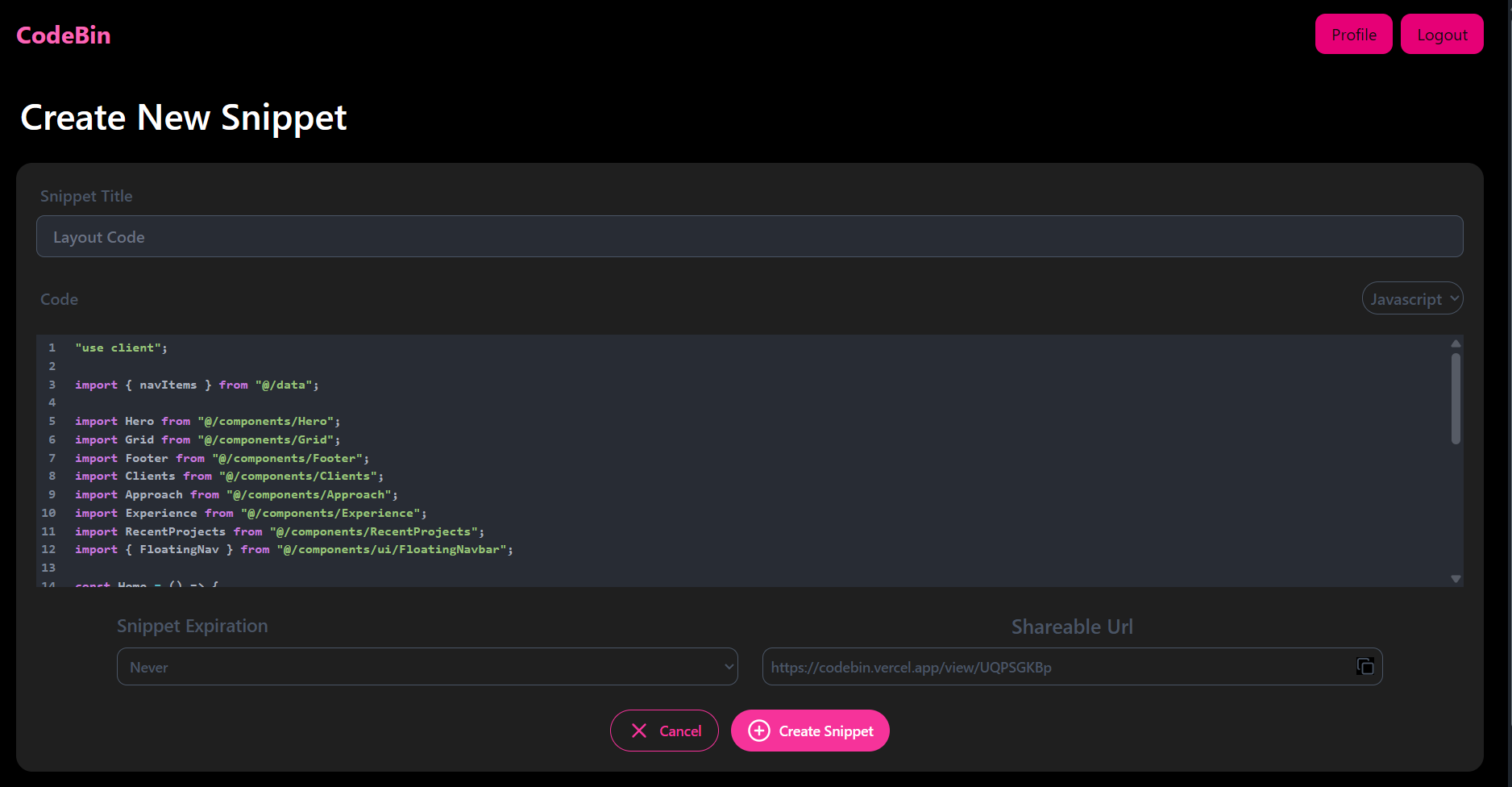 A modern Pastebin alternative built with React and Node.js. Allows developers to instantly save, format, and share code snippets via unique URLs, featuring reliable persistence with MongoDB.